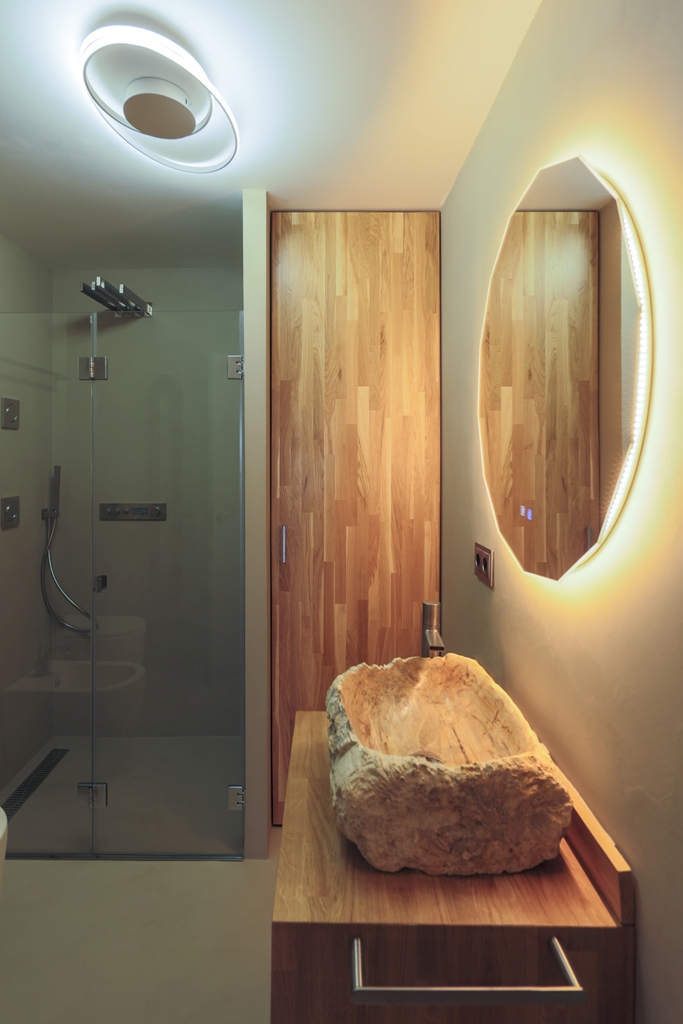 El mobiliario se ha diseñado a medida en madera maciza, combinando calidez y funcionalidad. La iluminación juega un papel clave: el espejo retroiluminado, junto con la luminaria escultórica del techo, crea una atmósfera envolvente y relajante, ideal para iniciar o cerrar el día. La continuidad del microcemento en suelos y paredes refuerza el efecto de caja homogénea, aportando serenidad y elegancia contemporánea.
