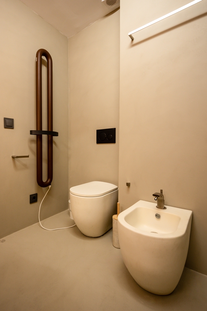 El inodoro y bidé suspendidos, de líneas suaves y orgánicas, se integran perfectamente con las paredes en microcemento continuo en tono arena. El radiador vertical, de diseño tubular en color bronce, funciona como toallero y escultura funcional. Todos los elementos de iluminación son de bajo consumo y regulables, pensados para generar distintas escenas según el momento del día.