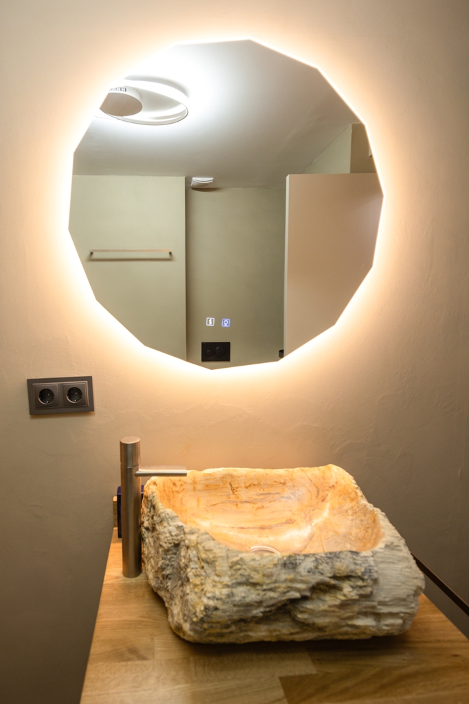 El lavabo ha sido esculpido a mano en piedra natural sin tratar, sobre un mueble de roble macizo con tiradores de acero inoxidable y acabado protector al agua. La grifería en acabado titanio aporta un toque de modernidad sin romper la armonía cromática.